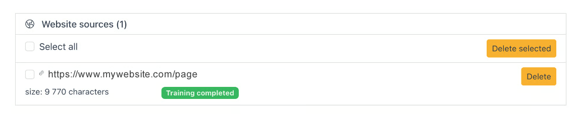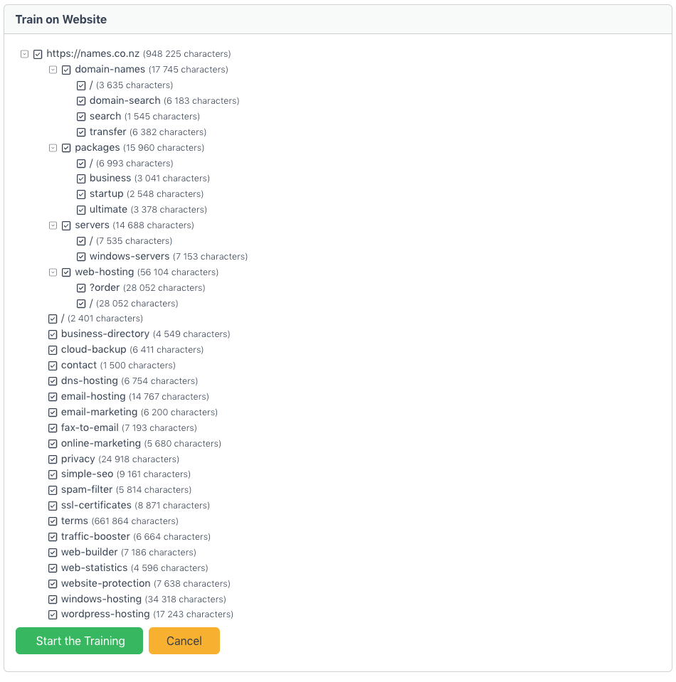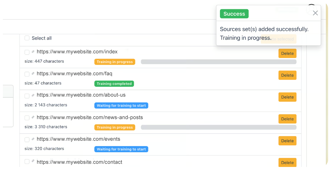 You can check or uncheck any items. Only checked links will be included for training. Click the button to “Start the Training” to index your selection. The form will disappear and you will see the list of website sources with their training progress/status.